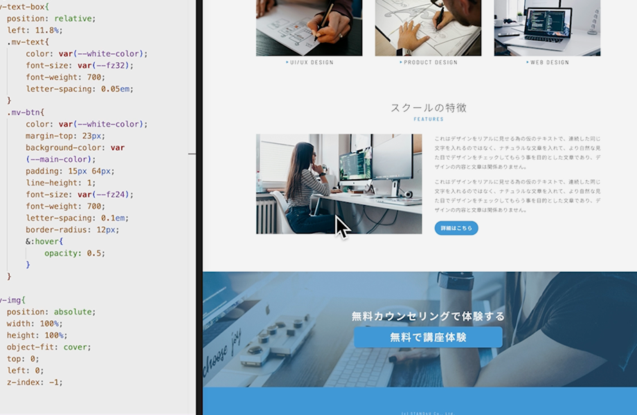 HTMLやCSSの基礎を身に着けたら、いよいよ実践コーディング!パソコン版スマホ版の両方を効率的に作成し、実務での注意点・CSSの管理方法など、現場で使える知識を手を動かして学びます。